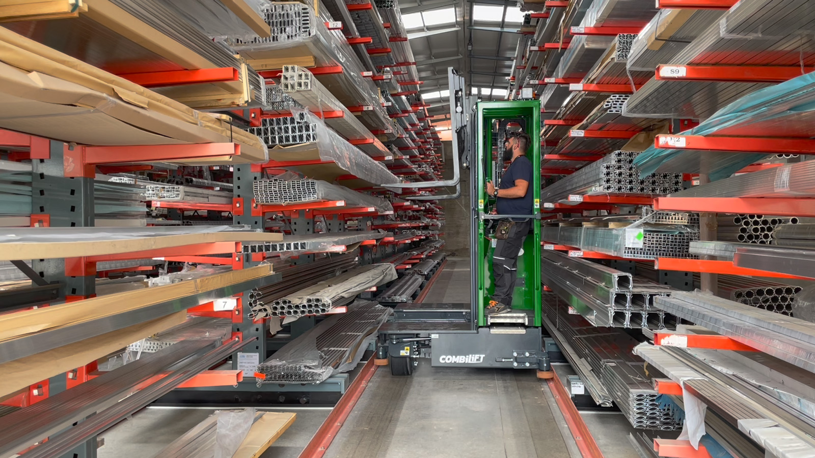 Nel magazzino dell’azienda, produttrice di zanzariere e tende, c’è una quotidiana movimentazione dei profili in alluminio, il cui ingombro comporta diversi accorgimenti in fase di trasporto e un particolare sistema di stoccaggio merci. Come vediamo sono carichi molto lunghi, complicati da movimentare all'interno di normali corsie, al contrario dalla merce abitualmente stoccata in bancali.