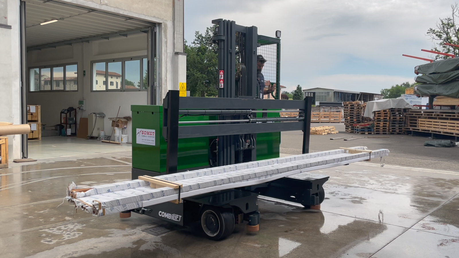 Nel filmato vediamo un carrello elevatore multidirezionale, in azione nella sede del nostro cliente Pronema ad Agrate Conturbia (No). Si tratta di un COMBILIFT C2500STE, operativo da giugno 2021.